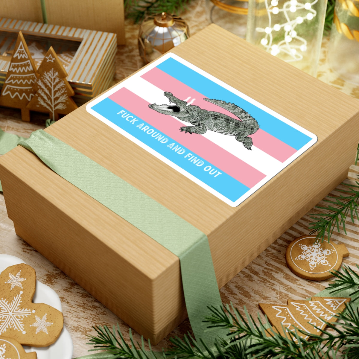 Transgender "Fuck Around and Find Out" Gator Rage LGBT PRIDE Flag Kiss-Cut Sticker Vinyl Decala bold declaration of defiance and unapologetic self-expression. This flag is more than just a piece of decor; it's a symbol of the fierce spirit that refuses to be silenced or oppressed. With its vibrant design and powerful message, it's perfect for anyone who embodies the indomitable rage and resilience of the LGBT community.