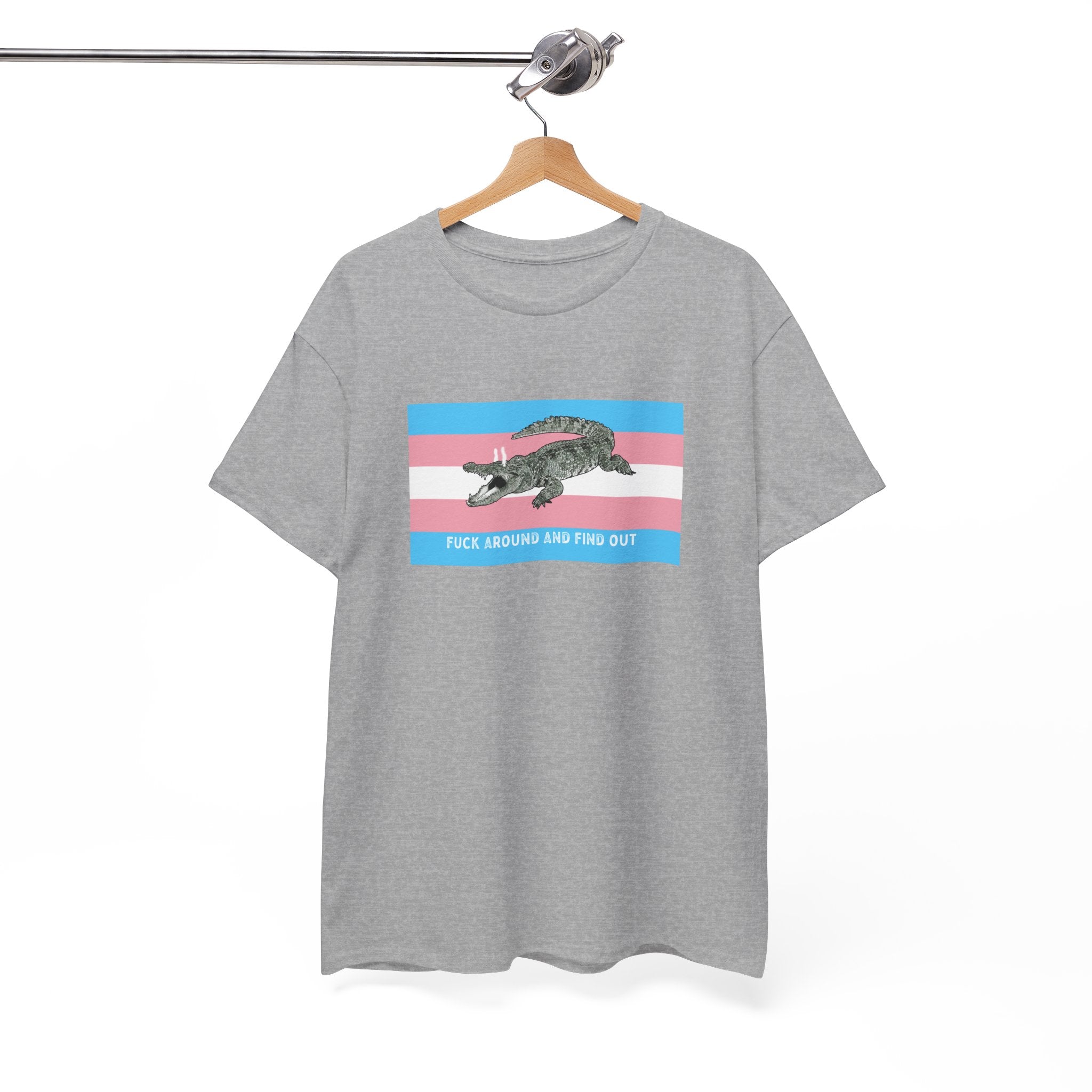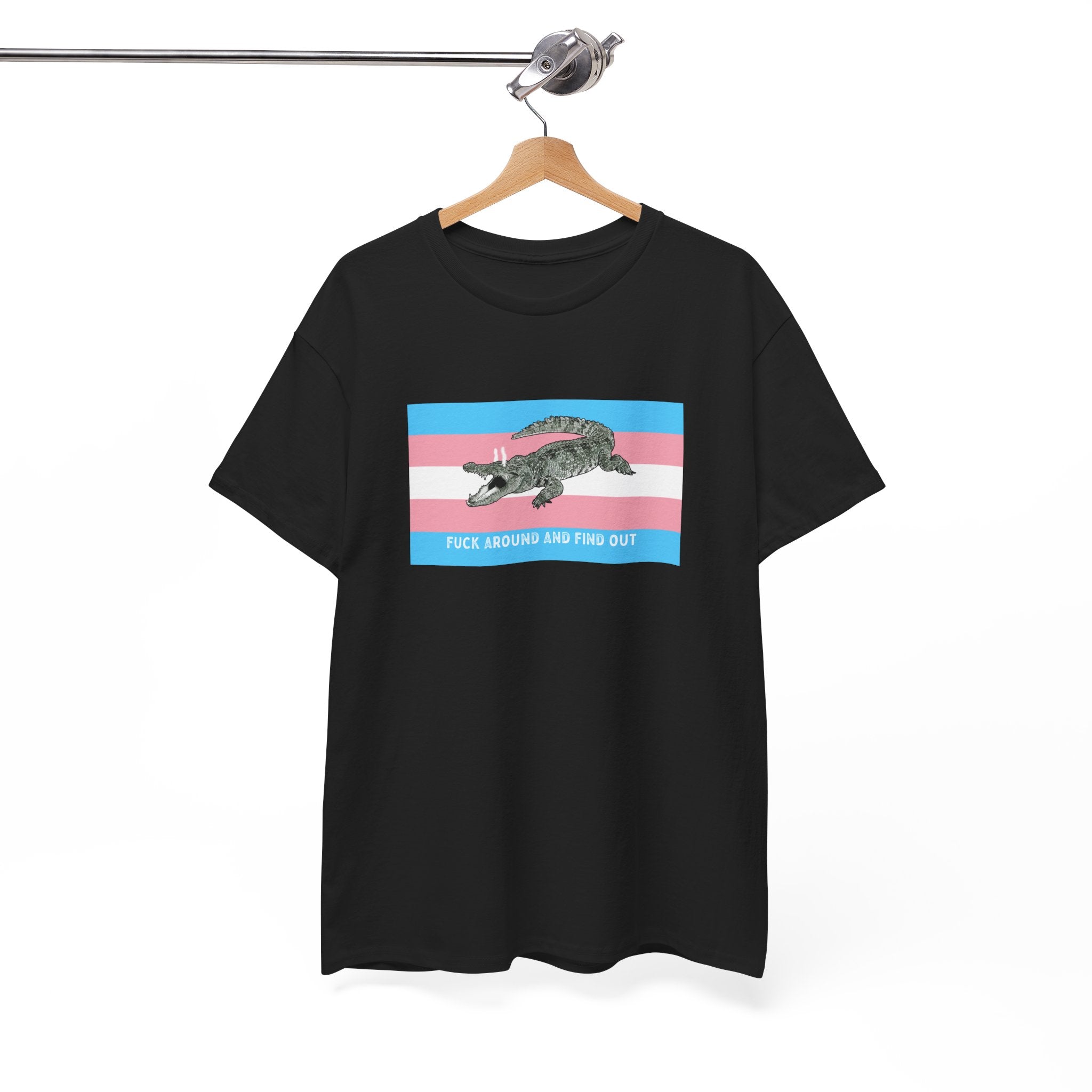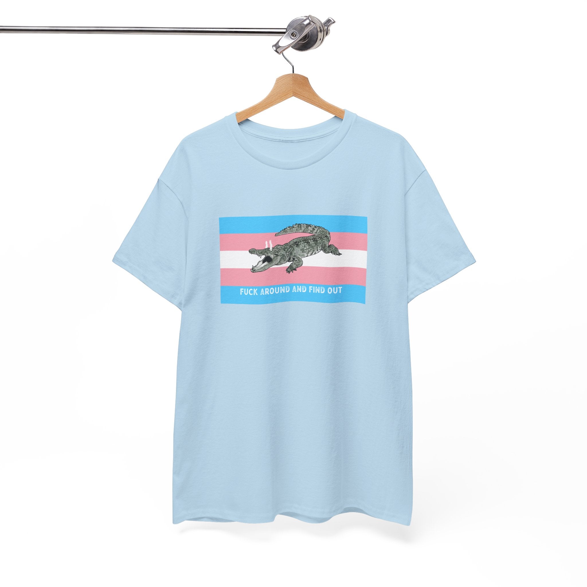 Transgender "Fuck Around and Find Out" Gator Rage LGBT PRIDE Flag T-Shirt - a bold declaration of defiance and unapologetic self-expression. This flag design is more than just a piece of apparel; it's a symbol of the fierce spirit that refuses to be silenced or oppressed. With its vibrant design and powerful message, it's perfect for anyone who embodies the indomitable rage and resilience of the LGBT community.